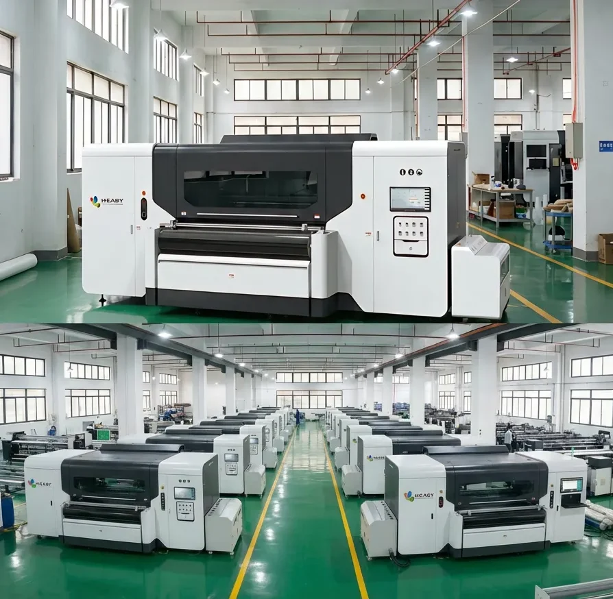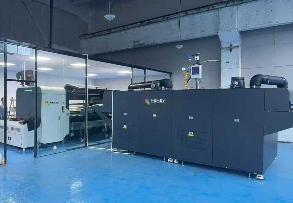 Transfer printing is faster to set up but faces fundamental limitations: re-sublimation risk under heat, limited suitability for raised-surface fabrics, and surface-only penetration that shows white fibre edges when stretched. H·EASY worked alongside DragonPlay Digital for over six months — China's first factory to achieve mass-scale high-temp disperse direct printing with 11 installed units.